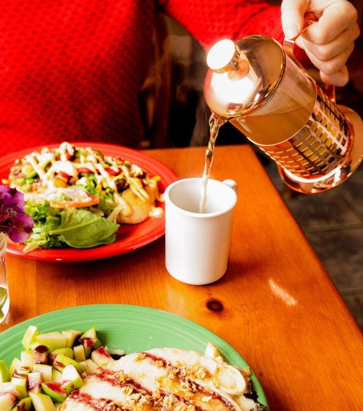 French presses are our preferred way to serve! It allows your guests the magic of watching their tea unfurl as it steeps, and dance as the tea is plunged in the water. It also allows the tea leaves room to breathe and expand in the water - offering your guests their most flavorful cup!